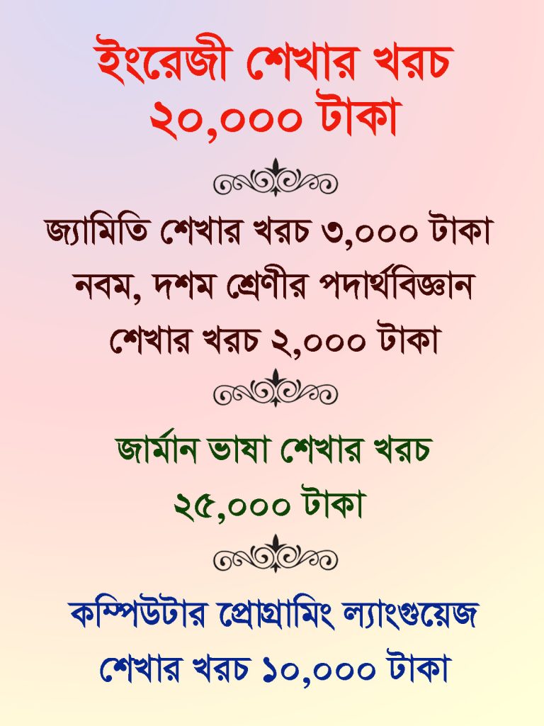 পাইলট হতে খরচ ২ কোটি টাকা। ডাক্তার হতে খরচ ২০ থেকে ৩০ লাখ টাকা। ইংলিশ মিডিয়ামে পড়াতে খরচ মাসিক ৩০ হাজার থেকে ৩ লাখ পঞ্চাশ হাজার টাকা পর্যন্ত। ইংলিশ মিডিয়ামে ক্লাস টেন পর্যন্ত পড়াতে প্রায় আধা কোটি টাকা প্রয়োজন হয়। ইংলিশ ভার্সনে পড়াতে খরচ মাসিক ২৫ থেকে ৩০ হাজার টাকা। ইংরেজী শেখাতে বাজেট করতে হবে কমপক্ষে ১ লক্ষ টাকা। জ্যামিতি, পদার্থবিজ্ঞান, রসায়ন বিষয়গুলো শেখার সাথে সাথে পরীক্ষা করারও বিষয় আছে। তাতে অনেক খরচ হয়। গড়ে মুখস্থবিদ্যা দিয়ে কাজ সারলে এসব খরচ প্রয়োজন হয় না।