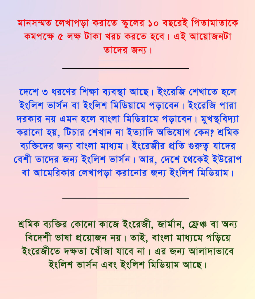 গরীব মানুষ/ শ্রমিক ব্যক্তির জন্য বাংলা মিডিয়াম। ইংরেজী শেখা প্রয়োজন হলে ইংলিশ মিডিয়াম, ইংলিশ ভার্সন। বাংলা মিডিয়ামের ছাত্রছাত্রী মানে তাদের পিতামাতার ইংরেজীর গুরুত্ব নেই। চাকরিতে ইংরেজী না পারার কারণে বা বাংলা মিডিয়ামে পড়েছে বলে চাকরি দিয়ে দেবে এমনটা হবে না।